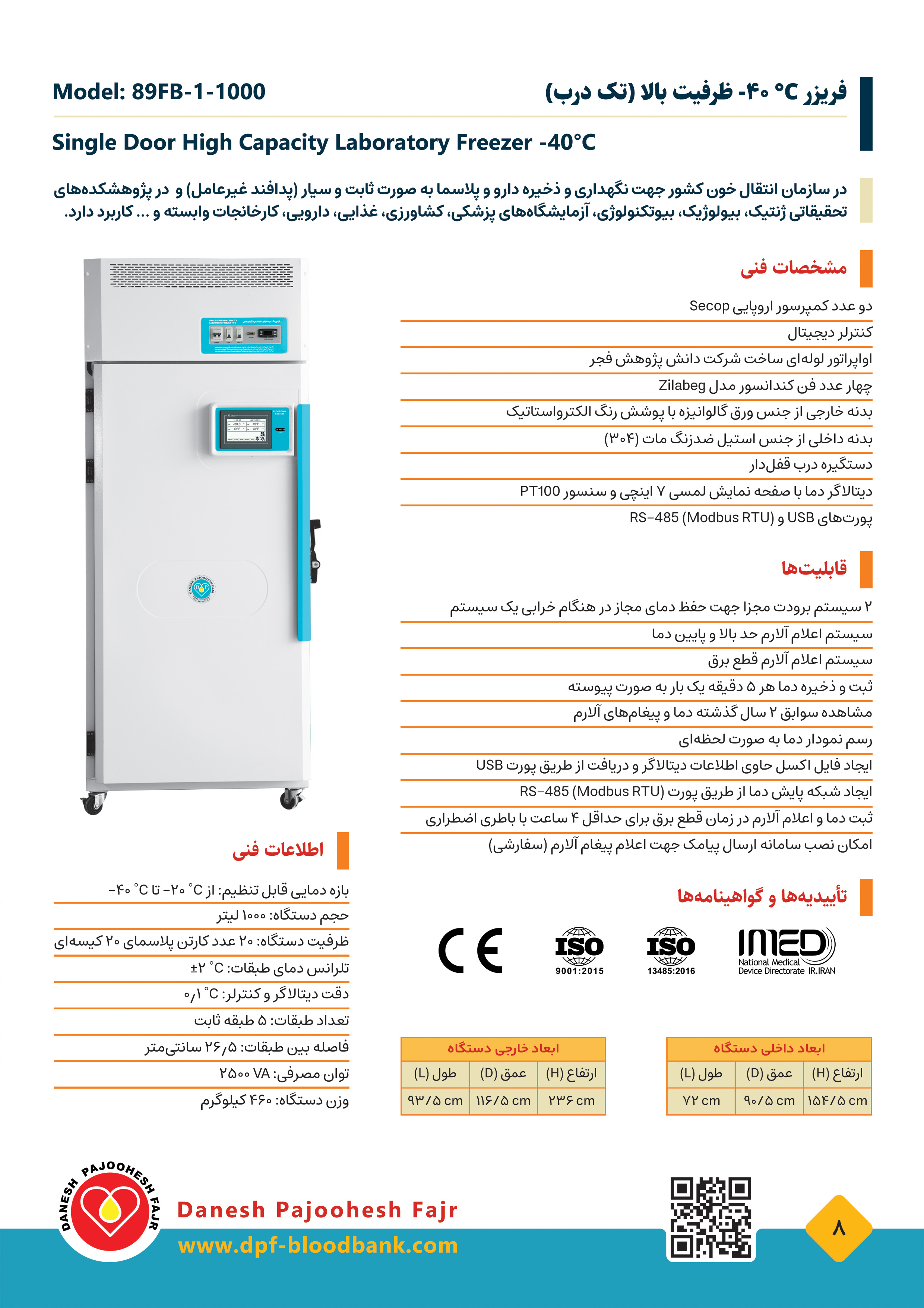 مشخصات محصول یخچال آزمایشگاهی نگهداری (واکسن، دارو، کیت) تک درب دو سیکل با ظرفیت بالا مدل 89FB-1-1000