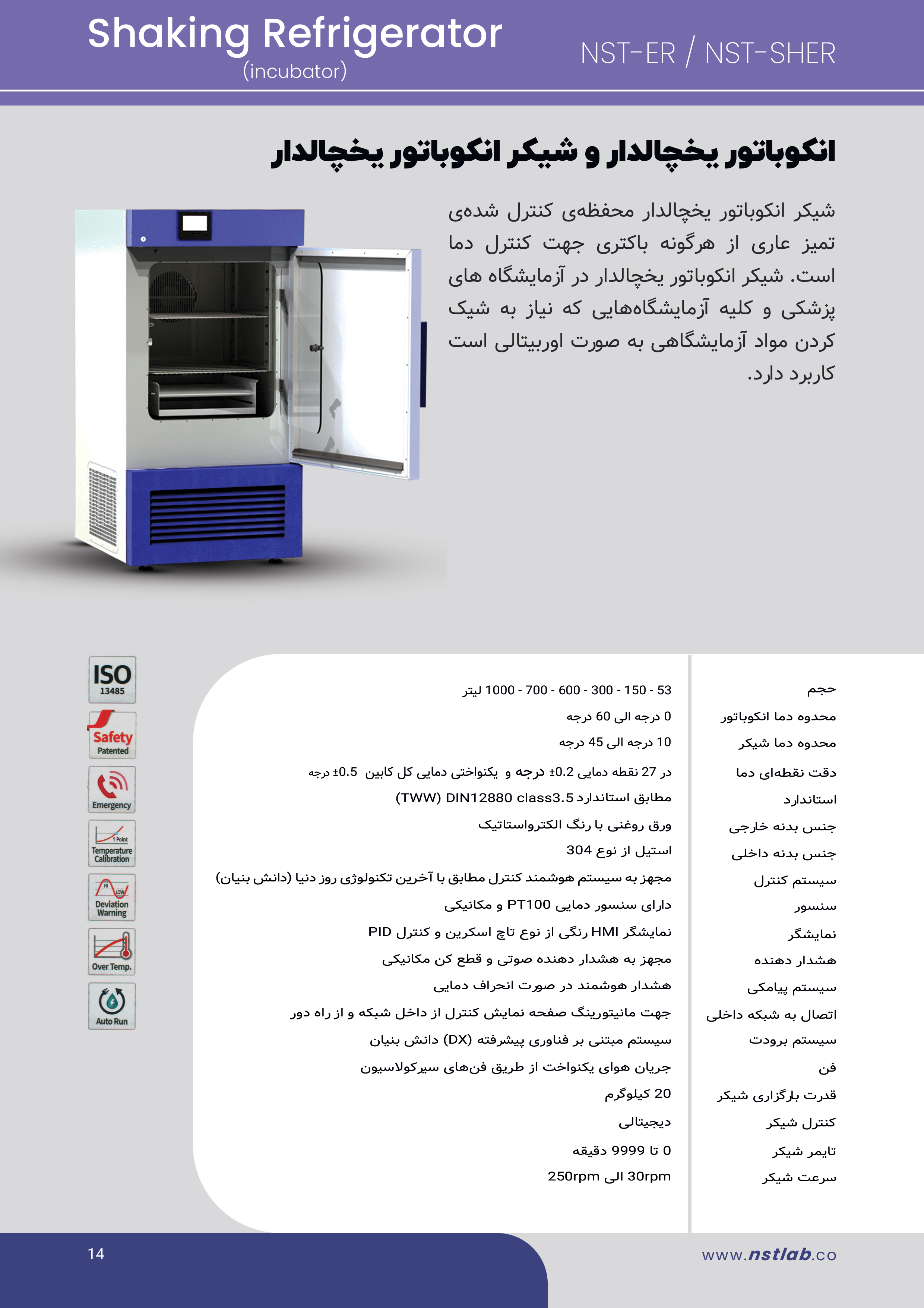 مشخصات محصول شیکر انکوباتور یخچالدار 600 لیتری یک طبقه مدل A مدل NST S H E R 600-1-A