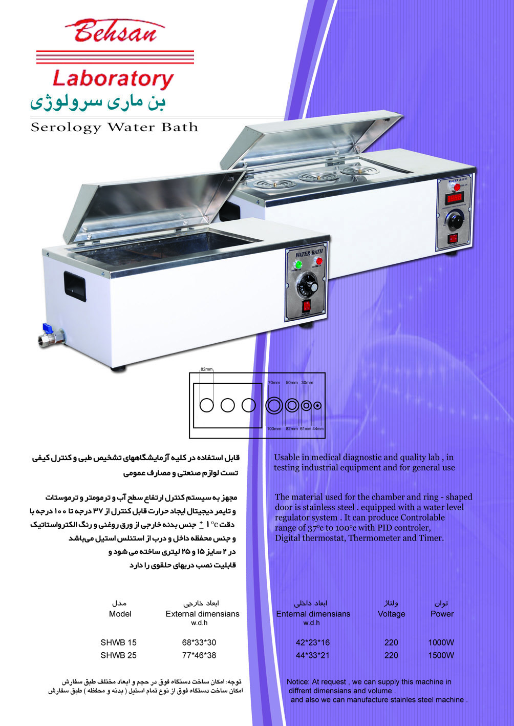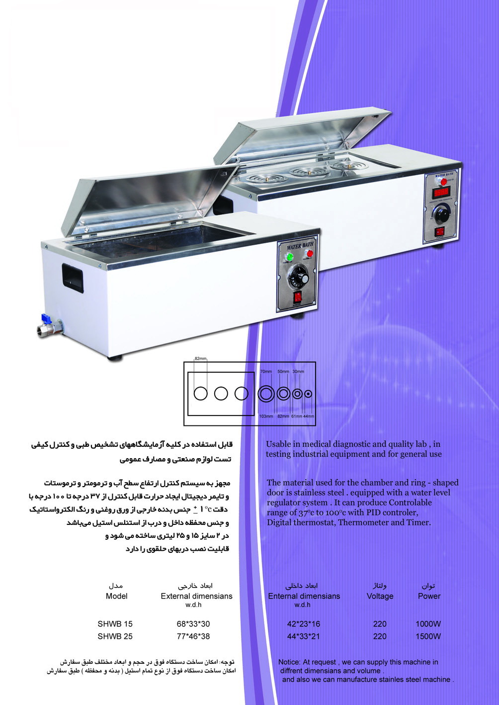 برای حرارت دادن ویا استفاده از محیطی که نباید حرارت مستقیم به ظرف یا وسیله ای وارد شود و منظور از این حرارت حداکثر حرارت آب جوش و یا حرارتهای کمتر در حدود 37درجه است . اینگونه محیطها غالبا باید از نظر دما کنترل شوند و محفظه نیز داری درب باشد بطوریکه بخار ناشی از گرم شدن و تبخیر آب روی ظرف داخل برگشت نکند .بدین منظور این وسیله بگونه ای طراحی و ساخته شده که توانائی کنترل دمای آب رادارد ( از 37 درجه الی 100درجه ) با دقت یک دهم درجه و همچنین بعد از بسته شدن درب به ظروف داخل آسیب نمیزند و بخارات آب روی ظروف نمیریزد و ظروف نیز در داخل آب غوطه ور نمیشود . بدنه از ورق فولادی ضد زنگ با پوشش رنگ استاتیک و مخزن داخل نیز از استیل ضد اسید و المنتهای داخل آب مقاوم در برابر خوردگی و کنترل حرارت ترموستاتیک با نمایشگر دیچیتال