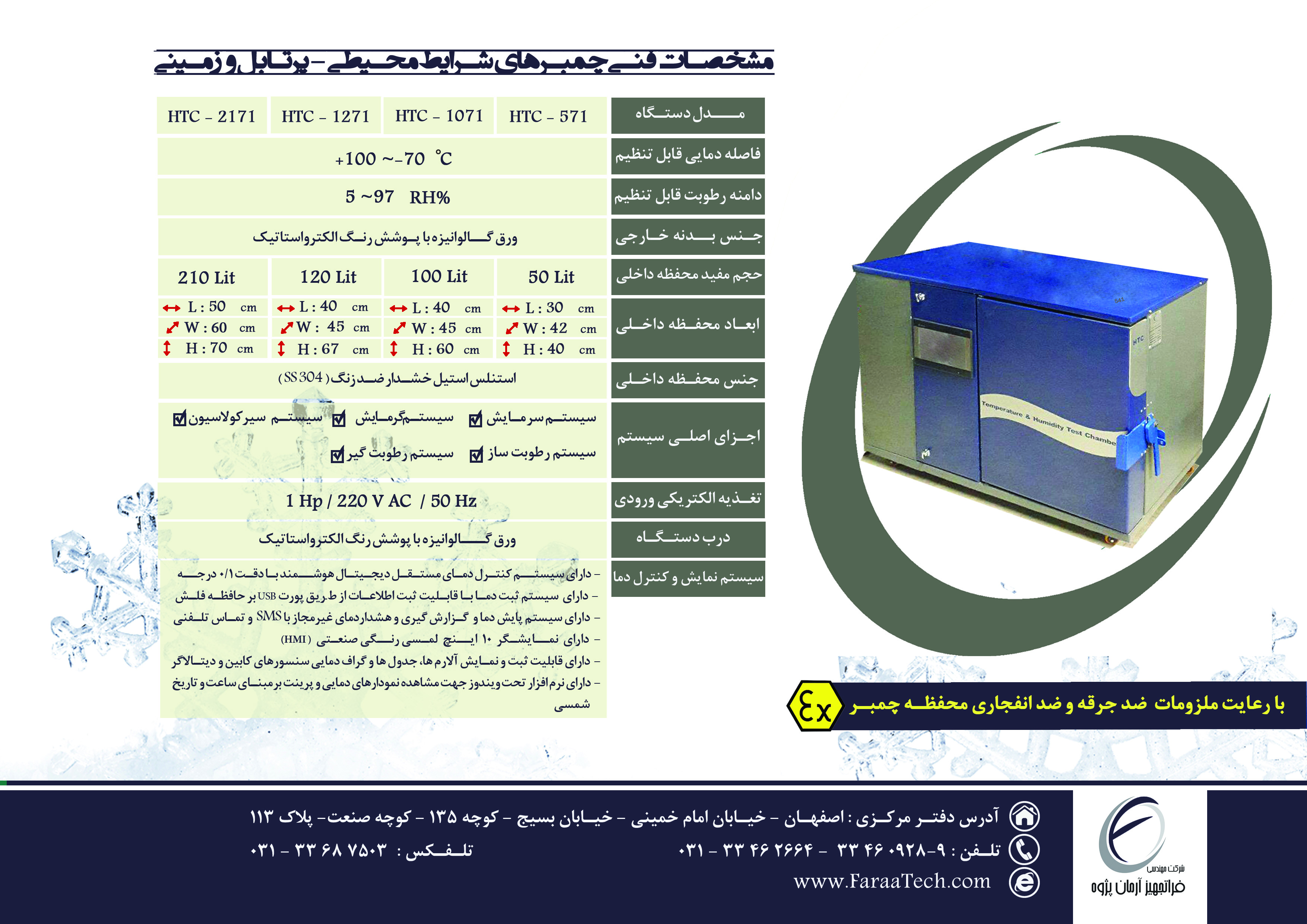 مشخصات محصول چمبر تست شرایط محیطی ( دما و رطوبت ) - 50 لیتری - 100 تا 70- درجه مدل HTC-571 در ششمین نمایشگاه تجهیزات