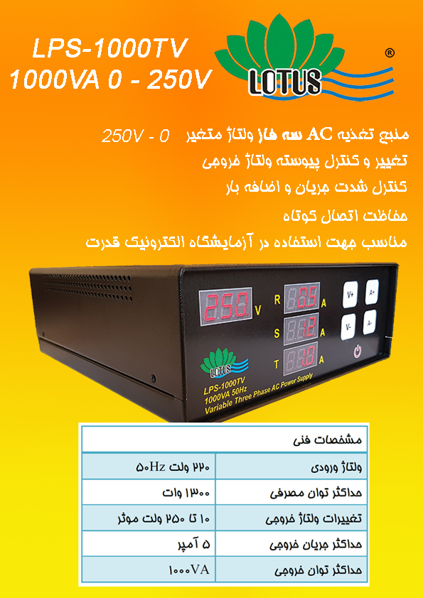مشخصات محصول منبع تغذیه AC سه فاز ولتاژ متغیر مدل LPS-1000TV در هفتمین نمایشگاه تجهیزات