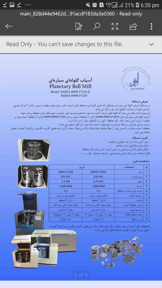 مشخصات محصول آسیاب گلوله ای سیاره ای مدل NARYA-MPM 4*250 در هفتمین نمایشگاه تجهیزات