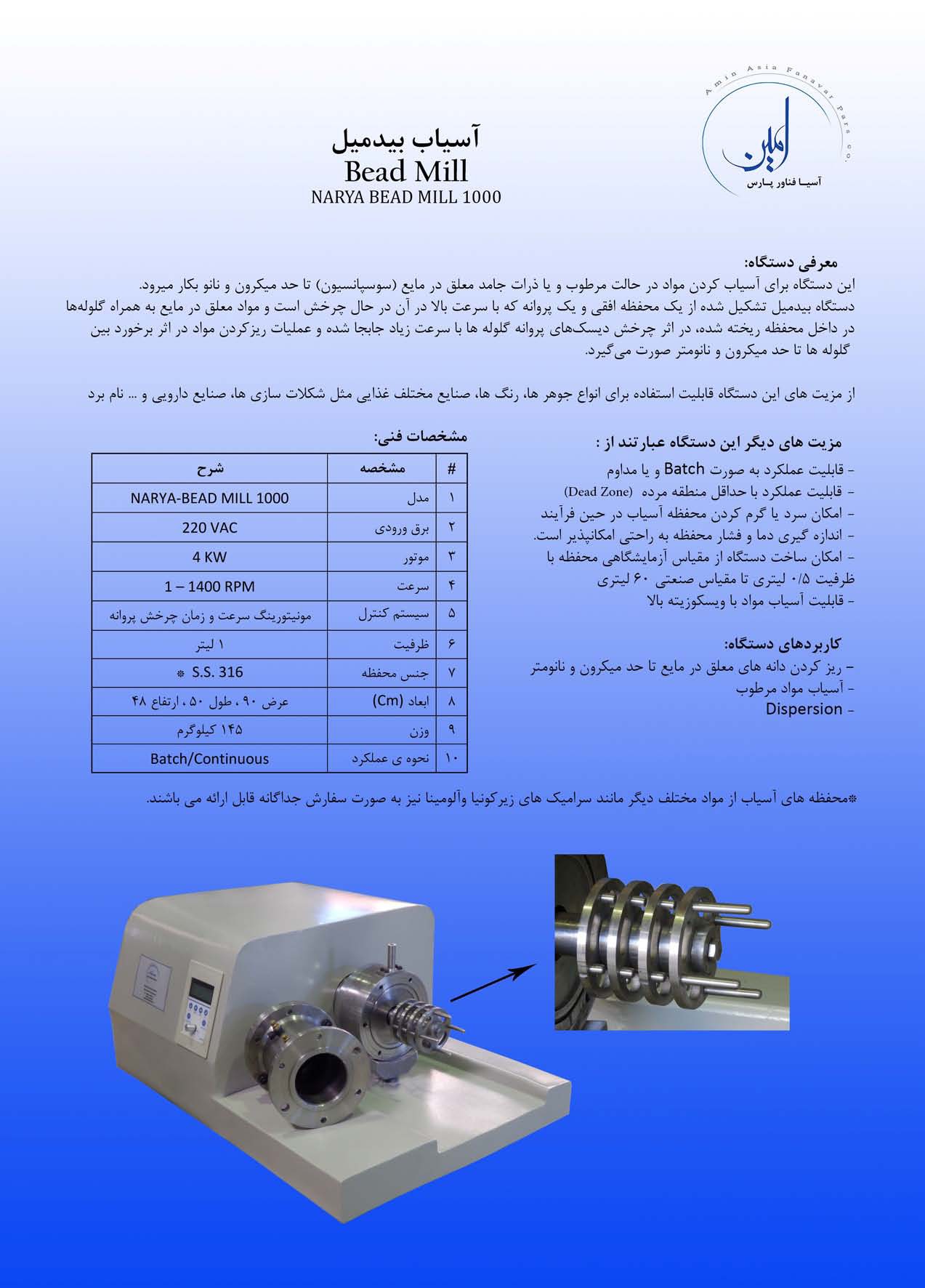 مشخصات محصول آسیاب بیدمیل مدل NARYA BEAD MILL 1000 در هفتمین نمایشگاه تجهیزات