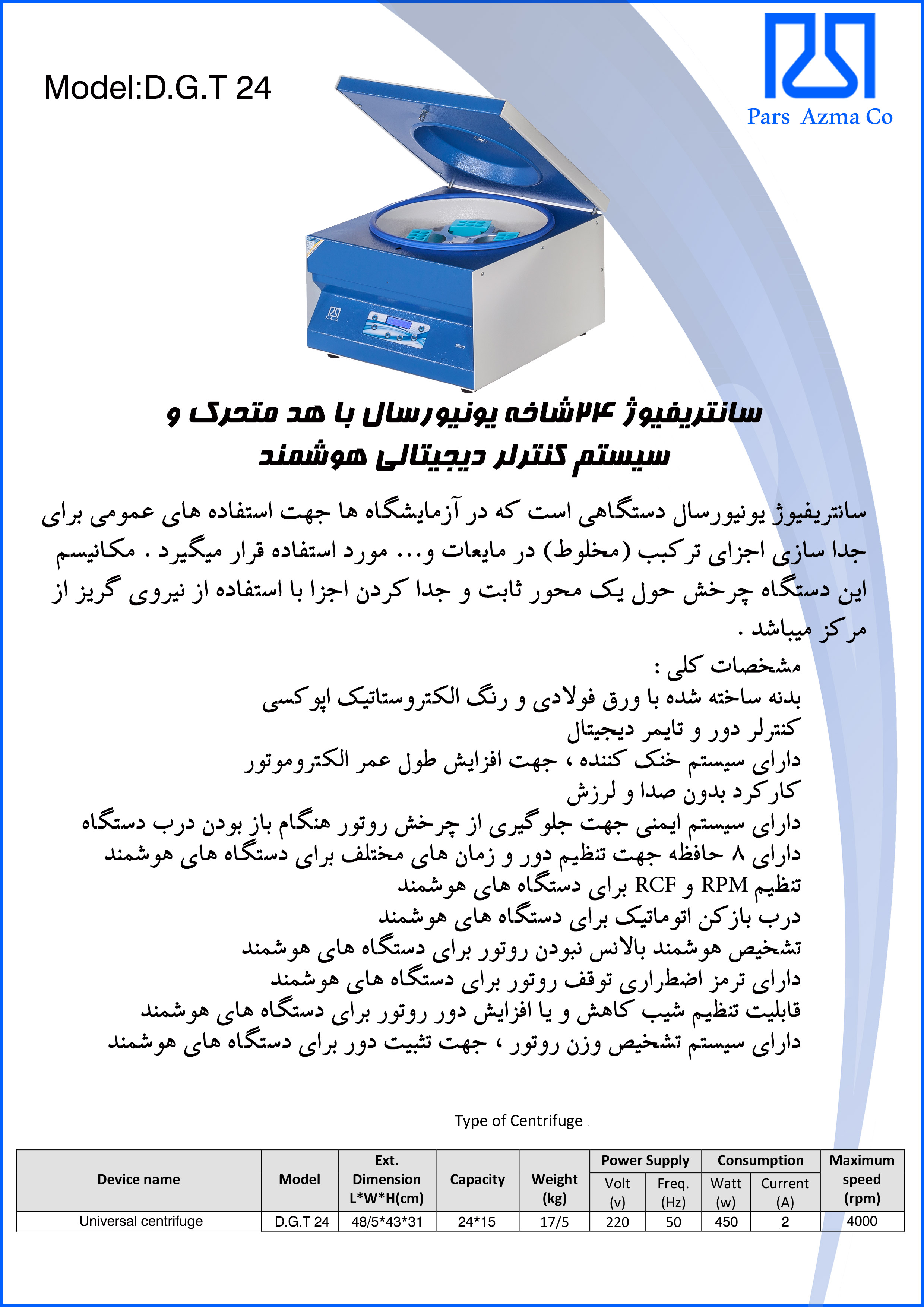 مشخصات محصول سانتریفیوژ 24 شاخه یونیورسال با هد متحرک و سیستم کنترلر دیجیتالی هوشمند مدل D.G.T 24 در هفتمین نمایشگاه تجهیزات